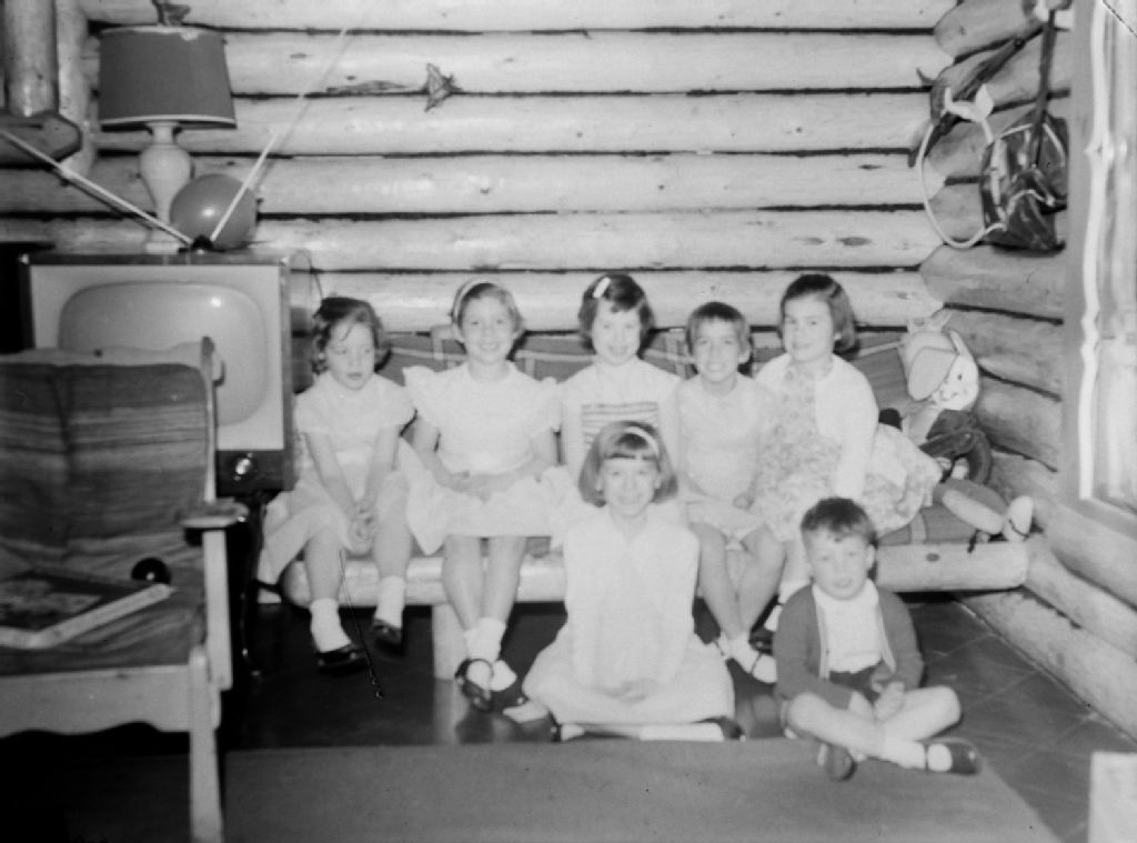 Un groupe de filles et un petit garçon sont réunis pour une fête organisée chez les Hope qui habitent avenue Dobie à Mont-Royal. Ils semblent être dans une pièce construite en bois rond
