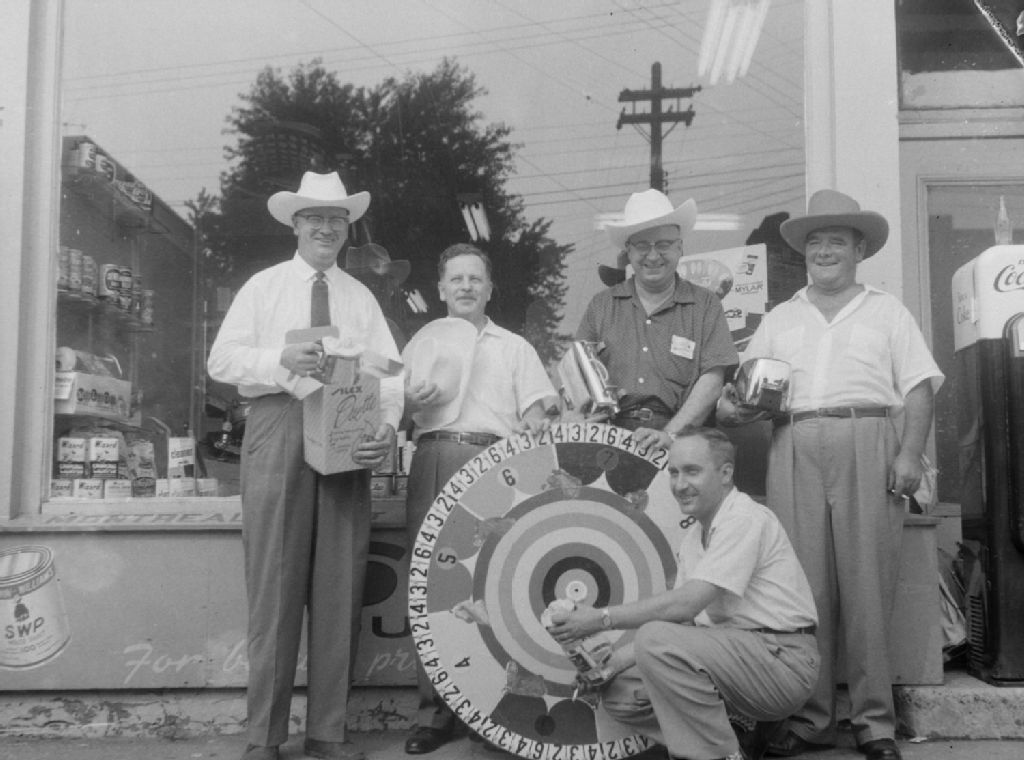 Nous voyons des hommes coiffés de chapeaux de cow-boy et tenant des petits appareils électroménagers près d'une roue numérotée servant aux jeux de hasard. Le carnaval auquel ils participent est organisé par des hommes d'affaires de Montréal-Ouest