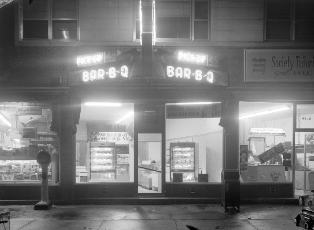 Nous voyons l'extérieur du comptoir de poulets à emporter Rita Bar-B-Q situé sur le chemin de la Côte-Saint-Luc à Côte-Saint-Luc. À travers les vitrines, nous apercevons les poulets embrochés qui grillent dans des fours