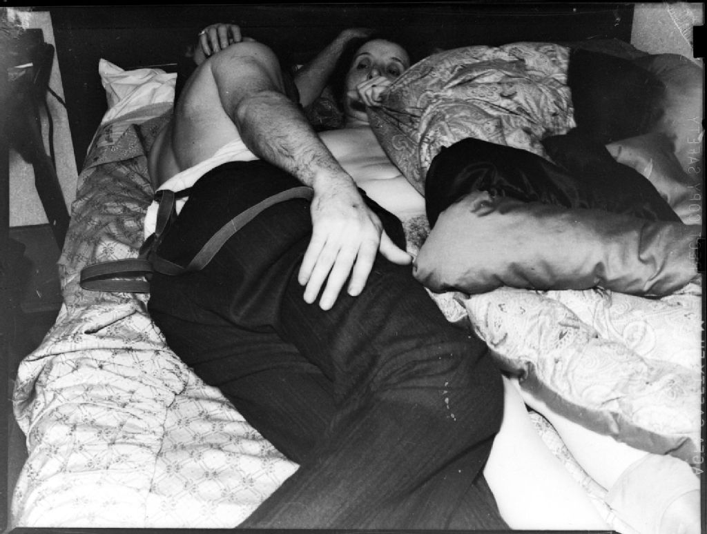 - Photographie d'enquête produite à la demande d'un détective. Nous voyons un homme et une femme couchés dans le lit de la chambre à coucher d'un appartement situé au coin des rues Bernard et Outremont à Outremont. La femme est nue et semble chercher à se couvrir