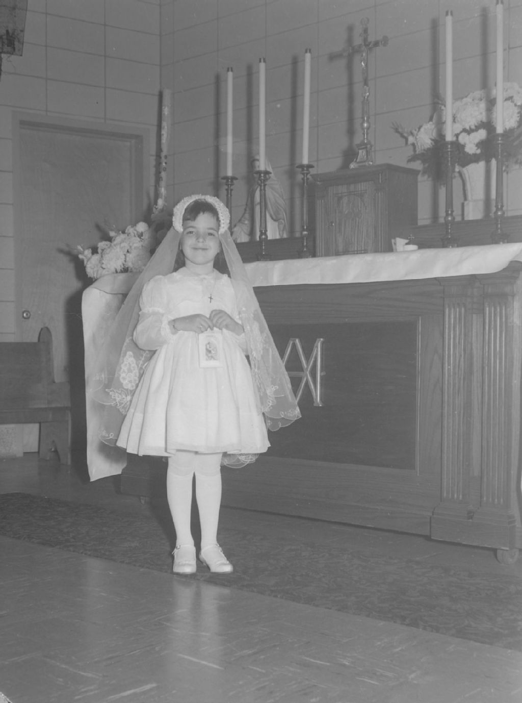 La petite Lilian Gregoire, coiffée d'un voile, se tient devant l'autel le jour de sa première communion