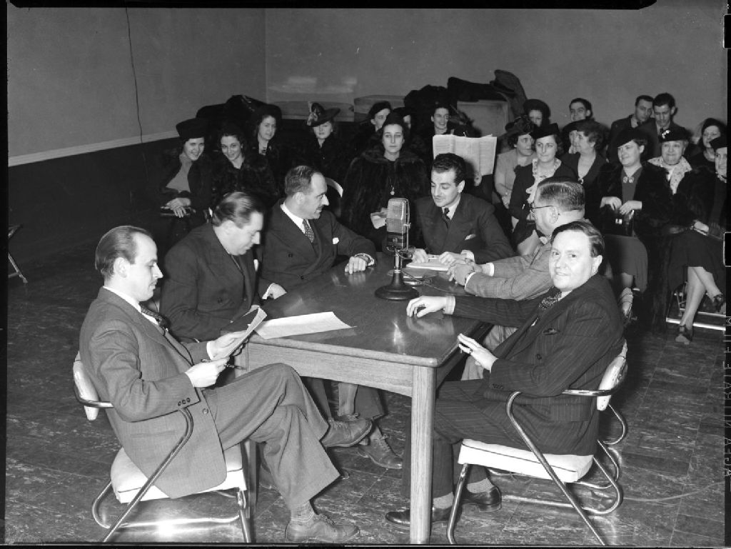 Groupe d'hommes rassemblés autour d'une table lors de l'émission radiophonique "Programme S.V.P." enregistrée devant un auditoire surtout féminin et diffusée par la station C.B.F. de (Radio-Canada), située au 1231 rue Sainte-Catherine Ouest à Montréal