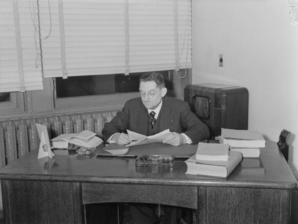 Monsieur Charles Bruno lisant un texte assis à son bureau de la station radiophonique C.B.F. (Radio-Canada), située au 1231, rue Sainte-Catherine Ouest à Montréal