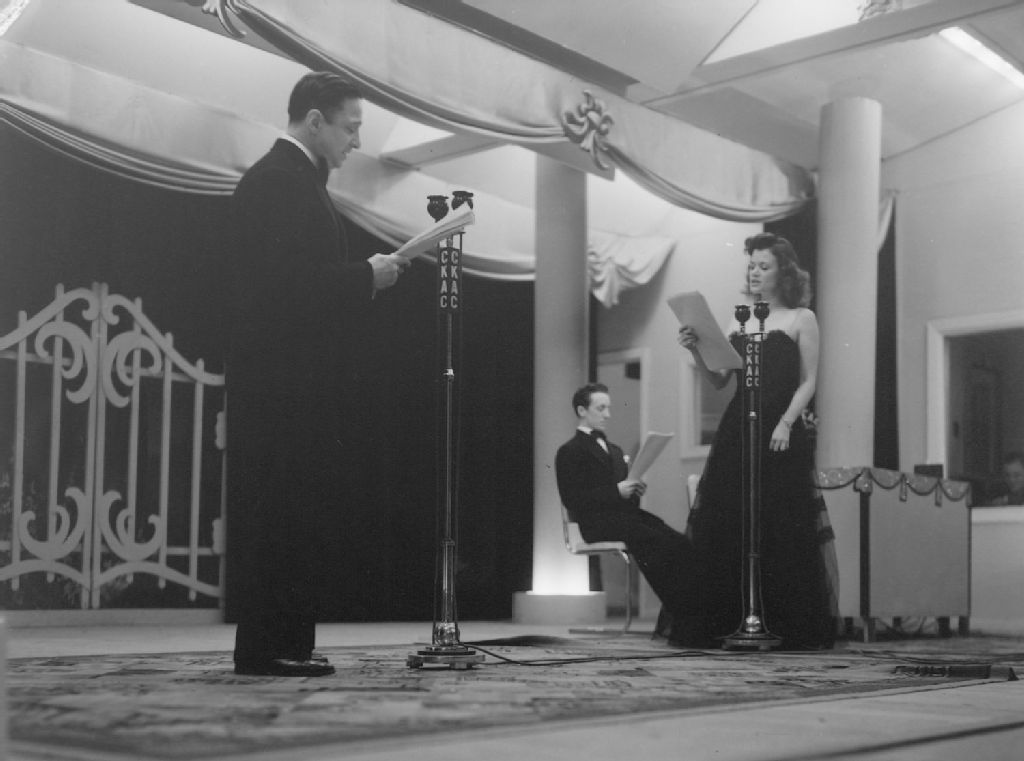 La vedette du cinéma français, Simone Simon, et Teddy Burns sont sur la scène du théâtre Lux lors d'une soirée radiodiffusée par la station C.K.A.C. à Montréal