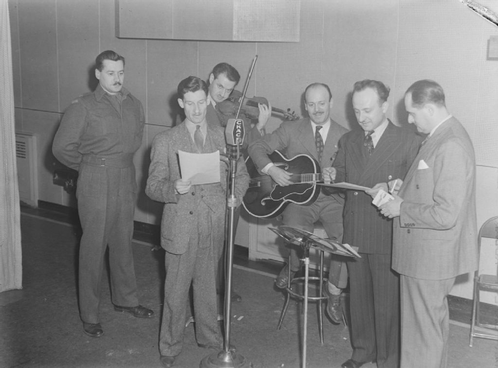 Enregistrement d'une émission musicale radiodiffusée par la station C.K.A.C., située au 980, rue Sainte-Catherine Ouest à Montréal. Nous apercevons de gauche à droite, le scripteur Marcel Baulu, l'animateur Lionel Parent, le violoniste Jack Norton, le guitariste, Georges Vincent, de même que Louis Bédard, directeur musical et Wilfrid Charland, réalisateur