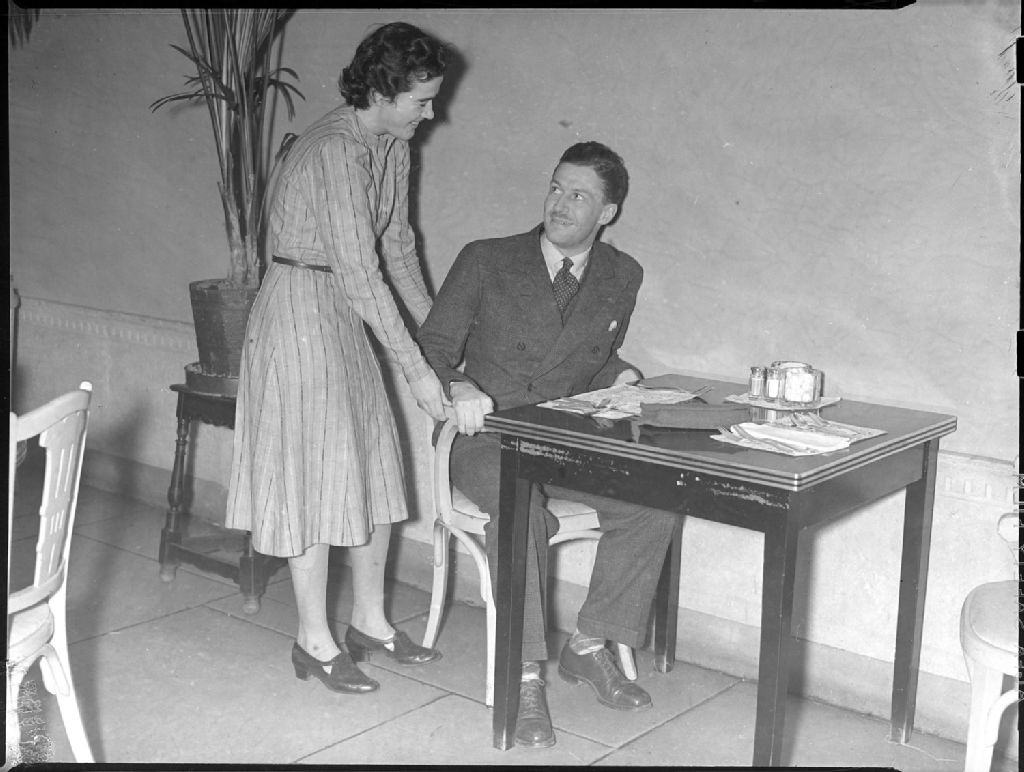 Peggy Lamb et Drummond Smith à l'intérieur du café de l'Hôtel Mount Royal, situé à l'angle des rues Sainte-Catherine Ouest et Peel