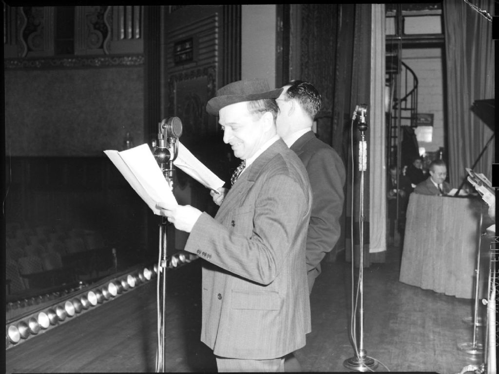 Le comédien Teddy Burns sur la scène d'une salle de spectacle lors de la radiodiffusion de l'émission "Tourbillon de la Gaieté" de l'auteur Roger Marien par la station C.K.A.C. à Montréal