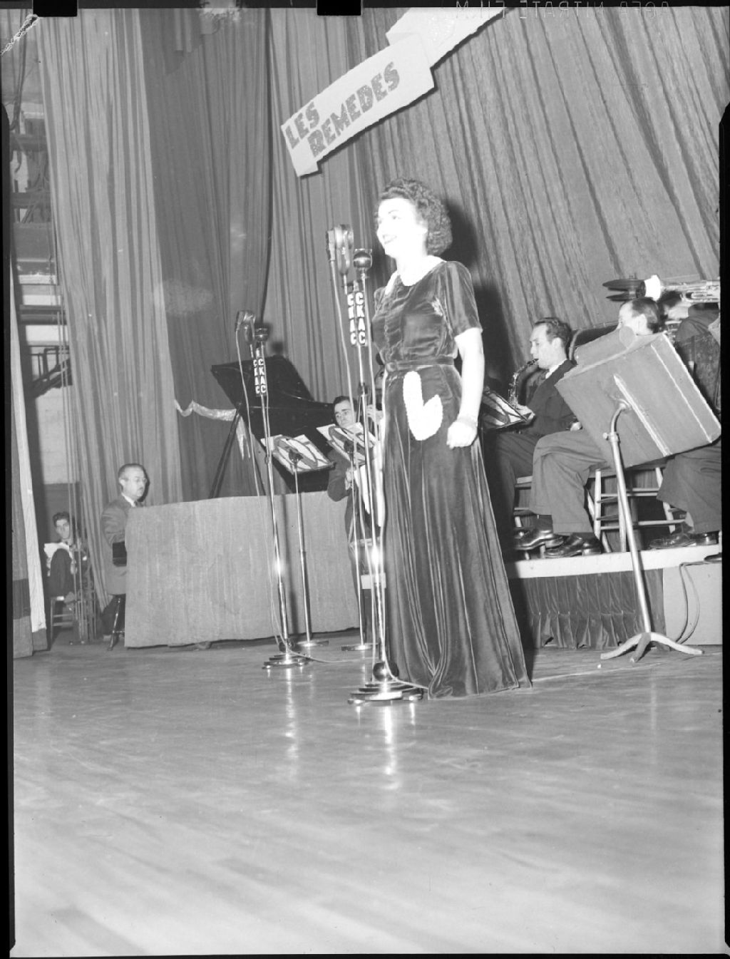La chanteuse Alys Roby accompagnée par un orchestre sur la scène d'une salle de spectacle lors de la radiodiffusion de l'émission "Tourbillon de la Gaieté" de l'auteur Roger Marien par la station C.K.A.C. à Montréal