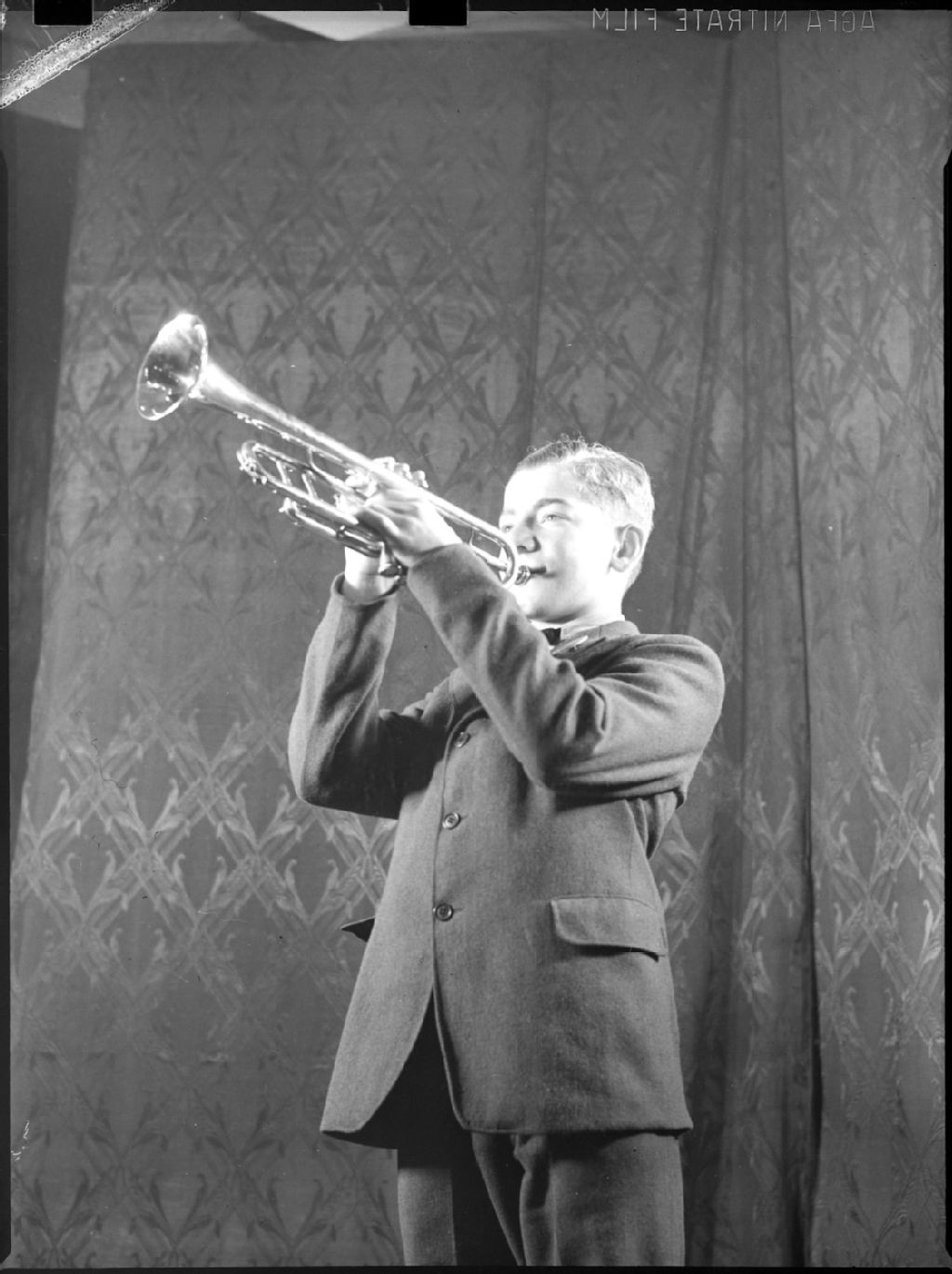 Un adolescent, Jacques Lanouette, jouant de la trompette lors de la soirée d'amateurs "Pain suprême" diffusée par la station radiophonique C.K.A.C., située au 980, rue Sainte-Catherine Ouest à Montréal