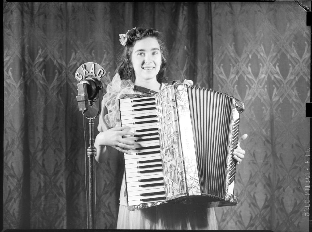 Une adolescente, Jacqueline Payette, jouant de l'accordéon chromatique lors de la soirée d'amateurs "Pain suprême" diffusée par la station radiophonique C.K.A.C., située au 980, rue Sainte-Catherine Ouest à Montréal