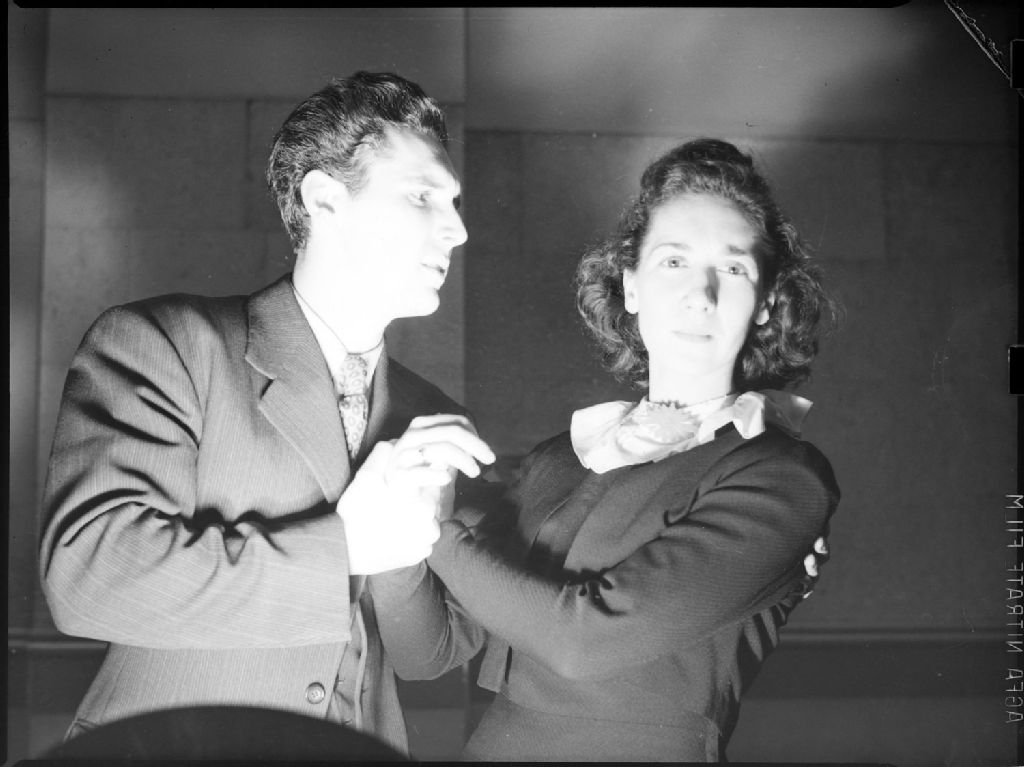 Le comédien Philippe Robert donnant la réplique à sa jeune partenaire pendant l'enregistrement du radioroman "L'Homme en noir" présenté sur les ondes de C.K.A.C. à Montréal