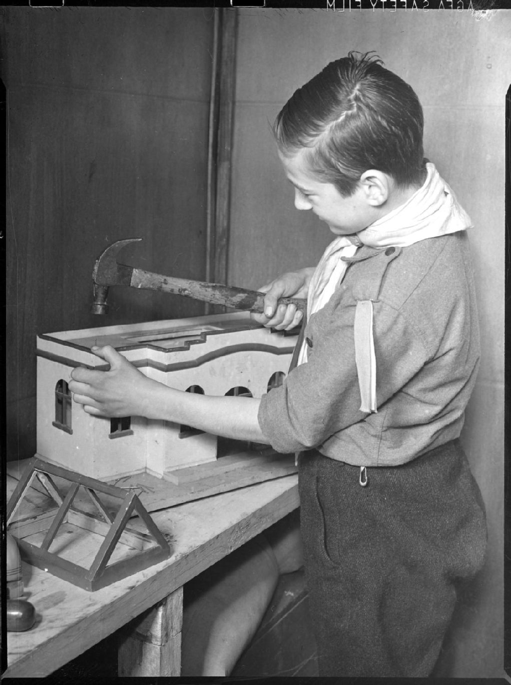 Nous voyons un garçon membre d'une troupe de scouts de Longueuil, en uniforme, bricolant une maison miniature à l'aide d'un marteau. Nous apercevons le toit de la maquette à ses côtés