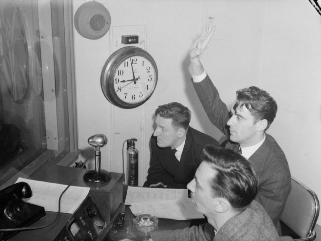 L'auteur dramatique Ernest Pallascio-Morin et le réalisateur Guy Mauffette donnant le signal d'entrée en ondes de l'émission "Frères d'armes" dans les studios de C.B.C. (Radio-Canada), situés au 1231, rue Sainte-Catherine Ouest à Montréal