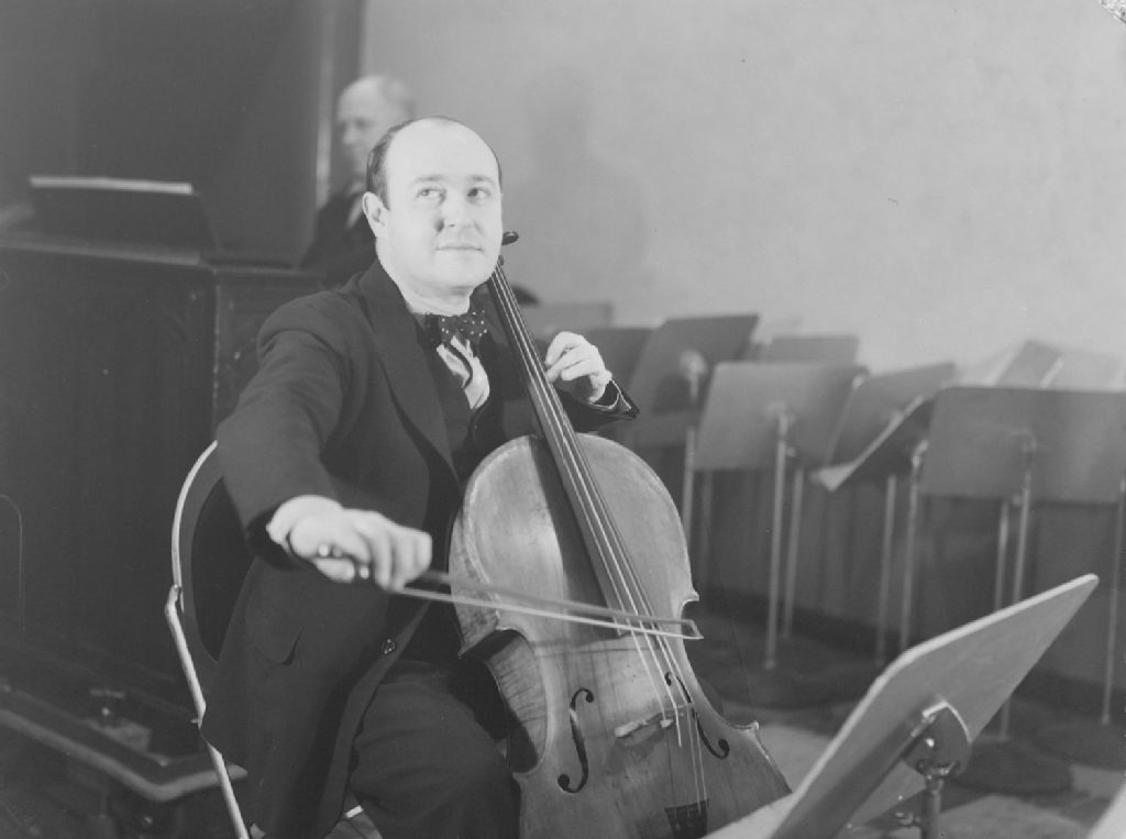 Un violoncelliste jouant pendant la radiodiffusion de l'émission "Les Troubadours de l'air", réalisée par M. S. L'Anglais sur les ondes de C.B.C. (Radio-Canada) à Montréal