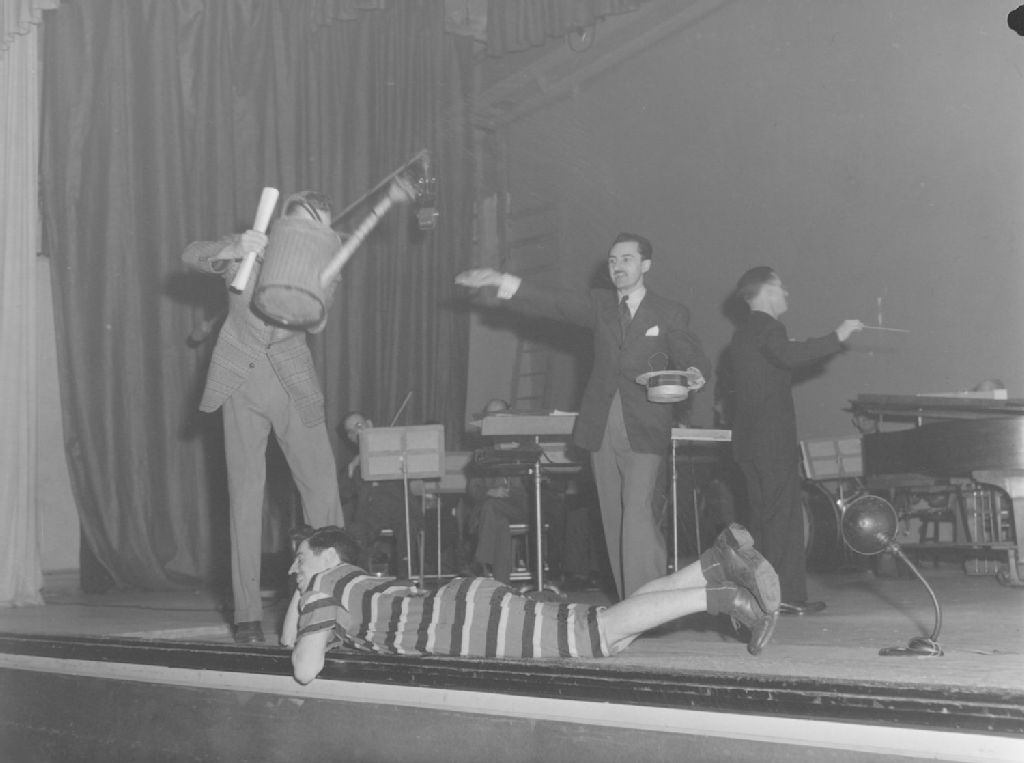 Trois fantaisistes et un chef d'orchestre sur scène pendant l'émission de variétés "Radio Carabin" diffusée en direct par C.B.C. (Radio-Canada) à Montréal. Nous apercevons un comédien en maillot de bain rayé allongé sur le bord de la scène pendant qu'un autre tient un arrosoir au-dessus de sa tête