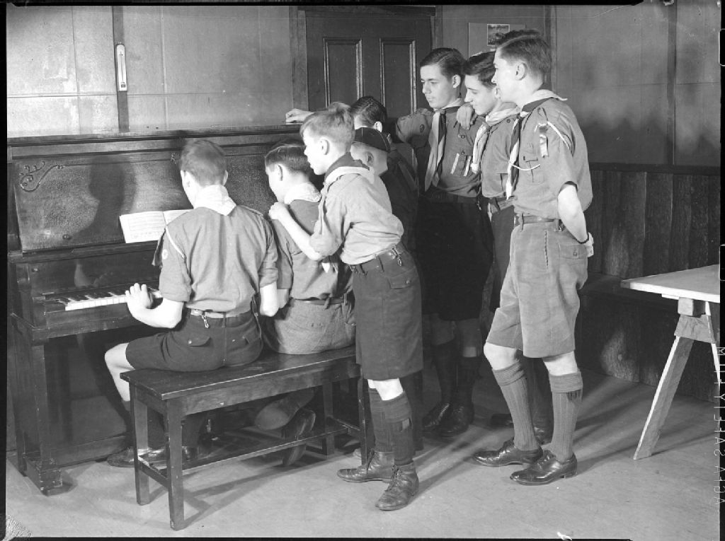 Nous voyons des scouts d'une troupe de Longueuil, posant en uniforme autour de deux garçons jouant en duo une pièce de musique sur un piano droit à l'intérieur du chalet appartenant à la troupe