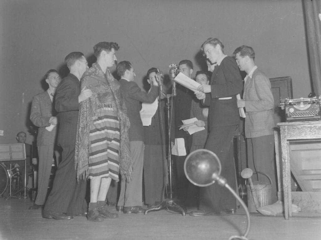 Groupe de chanteurs et de fantaisistes réunis sur scène autour d'un micro pendant l'enregistrement de l'émission de variétés "Radio Carabin" diffusée en direct par C.B.C. (Radio-Canada) à Montréal