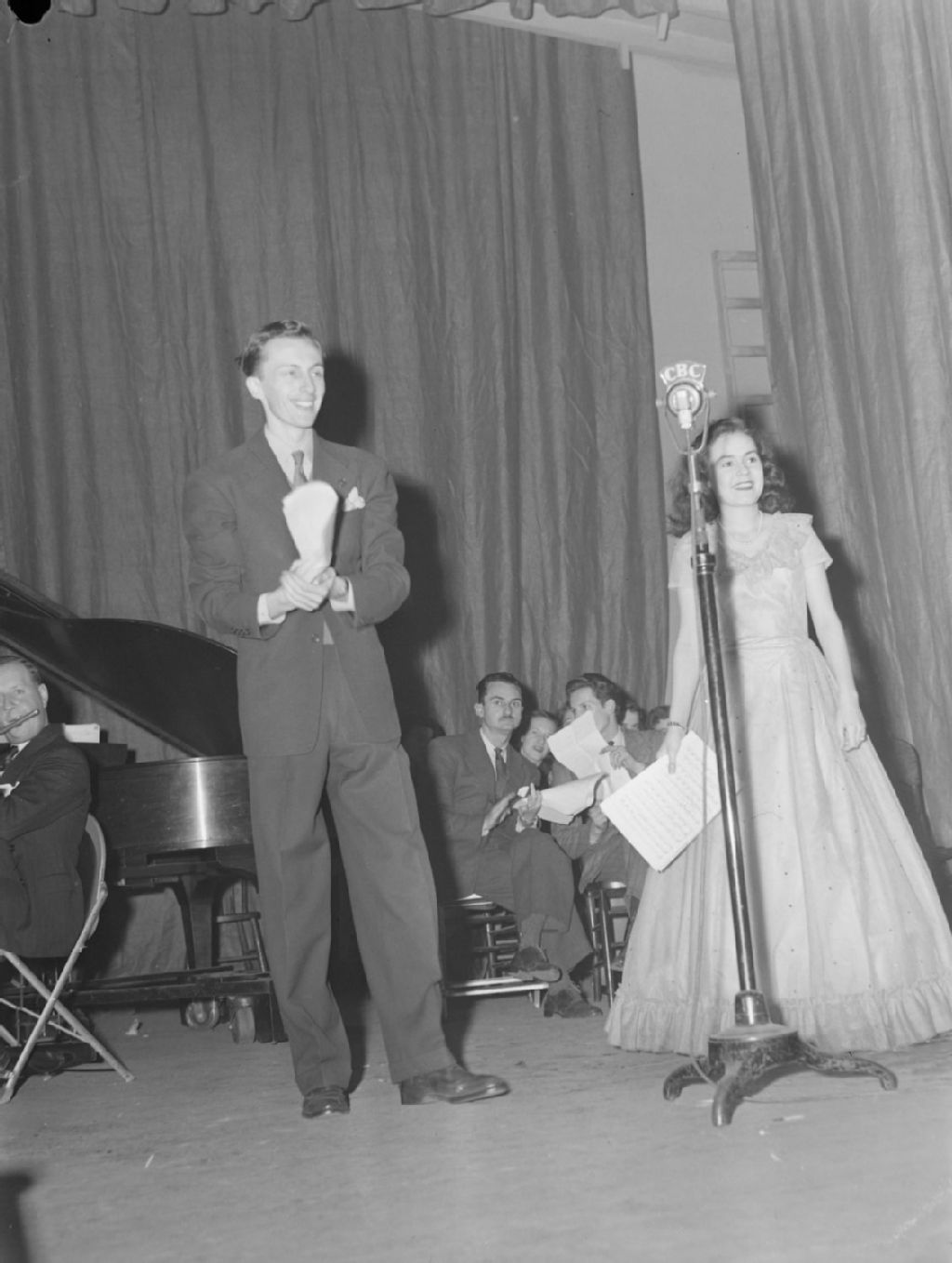 L'animateur Jean-Maurice Bailly présente la jeune soprano Claire Gagnier lors de l'enregistrement sur scène de l'émission "Radio Carabin" réalisé par Paul Leduc et diffusée par C.B.C. (Radio-Canada) à Montréal