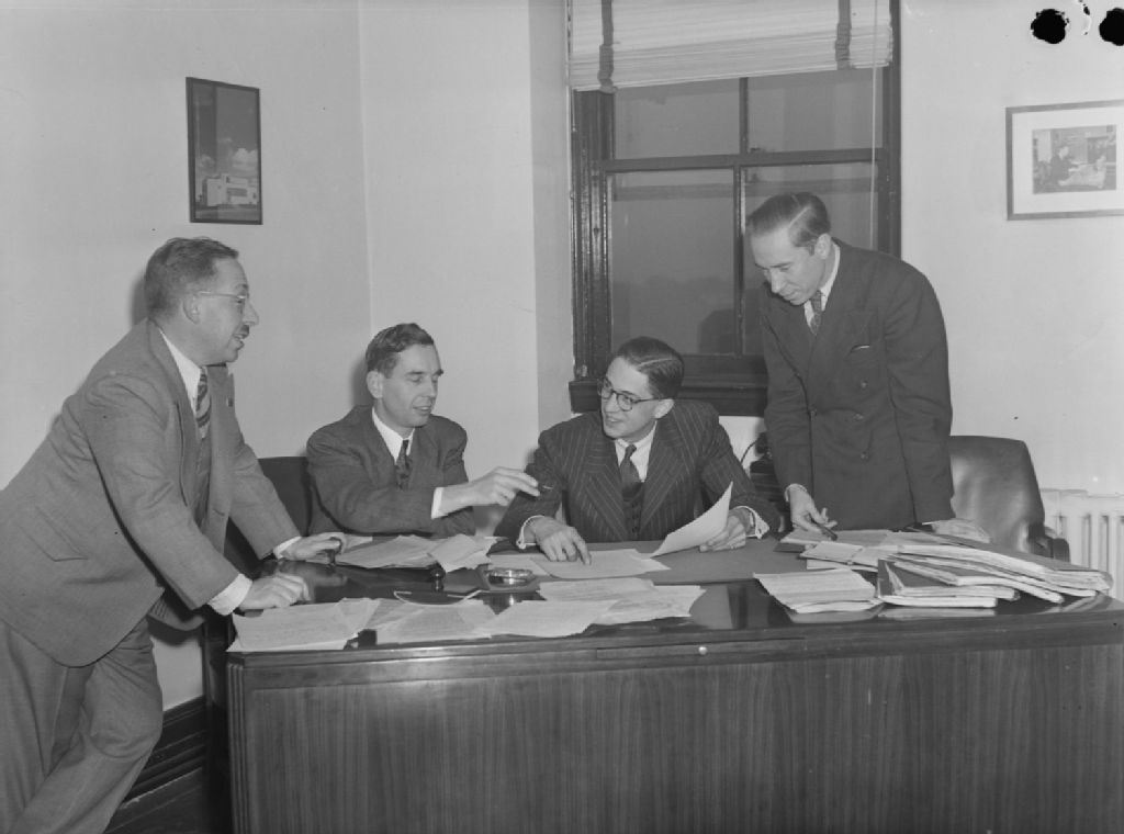 Quatre administrateurs de C.B.C. discutant autour d'un bureau dans les locaux du «Keefer Building», situé au 1440, rue Sainte-Catherine Ouest à Montréal