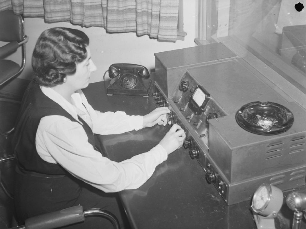 Madame Dandois, ingénieure du son pour le radioroman "Grande Soeur" de Louis Morisset diffusé à C.B.C. (Radio-Canada). Elle règle la console