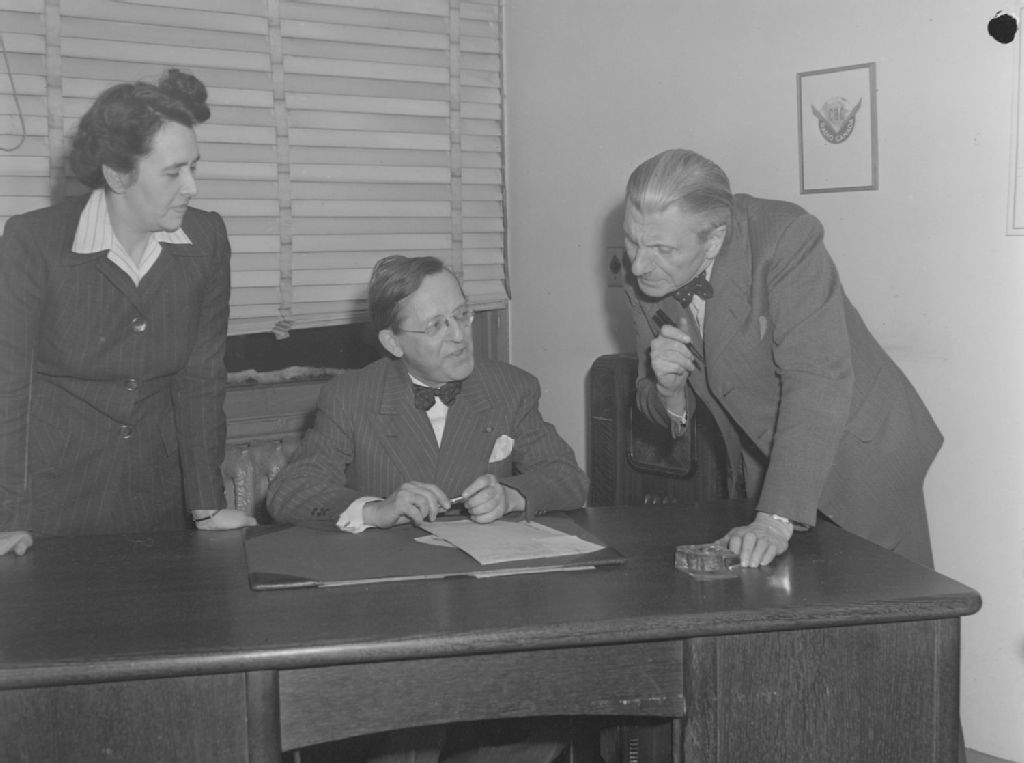 Monsieur Léopold Houlé, directeur des relations publiques de C.B.C., discutant avec le comédien Hector Charland ainsi qu'une femme dans son bureau de la rue Sainte-Catherine Ouest à Montréal