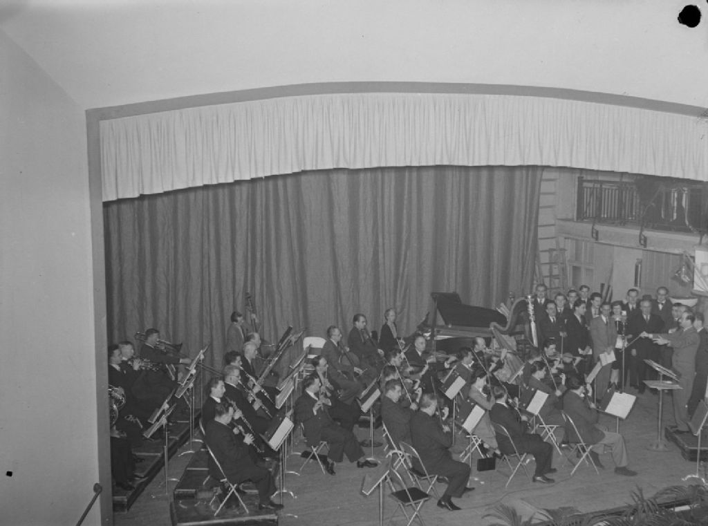 Le chef Jean-Marie Beaudet dirigeant sur scène l'Orchestre symphonique de Montréal alors que Roger Baulu anime au micro l'émission "Canadiana" retransmise par la station C.B.C. (Radio-Canada) à Montréal