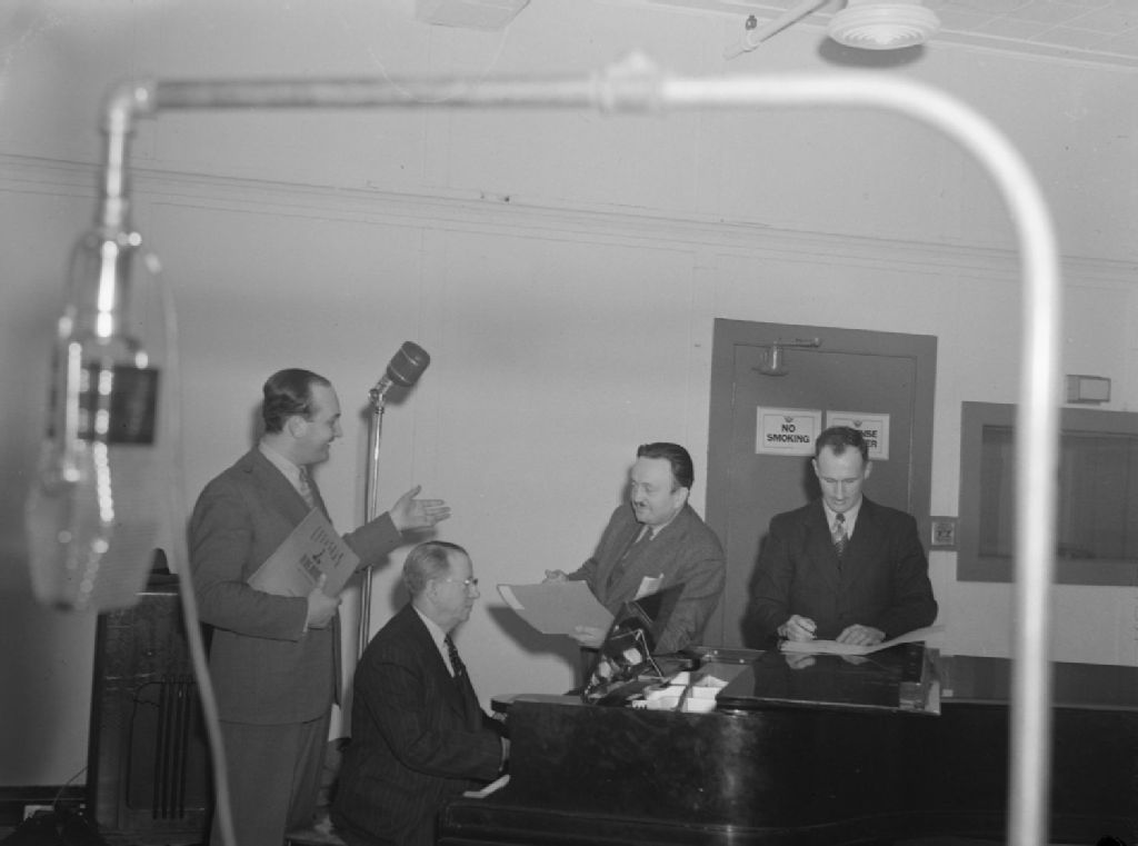 Trois chanteurs réunis autour d'un pianiste accompagnateur dans un studio de la station C.B.C. (Radio-Canada) à Montréal lors de l'enregistrement de l'émission "Réveil rural"