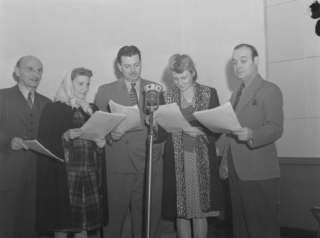 Groupe de comédiens interprétant une adaptation des "Mille et Une Nuits" diffusée par la station C.B.C. À Montréal. Nous apercevons, à l'extrême gauche, Georges Landrau et, à l'extrême droite, Jacques Auger