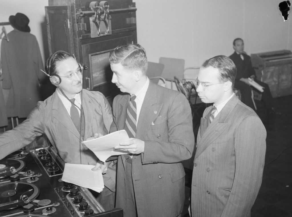 Simon L'Anglais, réalisateur de la série radiophonique "Taxi numéro 13" diffusée par C.B.C., donnant ses instructions au bruiteur A. Loiselle de même qu'à H. Laniel