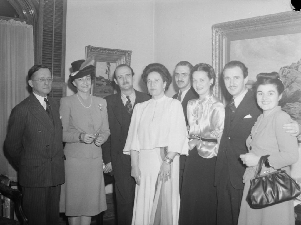 Groupe d'amis réunis au domicile de monsieur Paul Leduc, directeur dramatique et réalisateur la station radiophonique C.B.C. (Radio-Canada) à Montréal. Nous identifions. de gauche à droite, le directeur des relations publiques à la station radiophonique C.B.C. Léopold Houlé, personne non identifiée, le chef d'orchestre Jean-Marie Beaudet, personnes non identifiées, Hélène Fréchette-Leduc, Paul Leduc, personne non identifiée