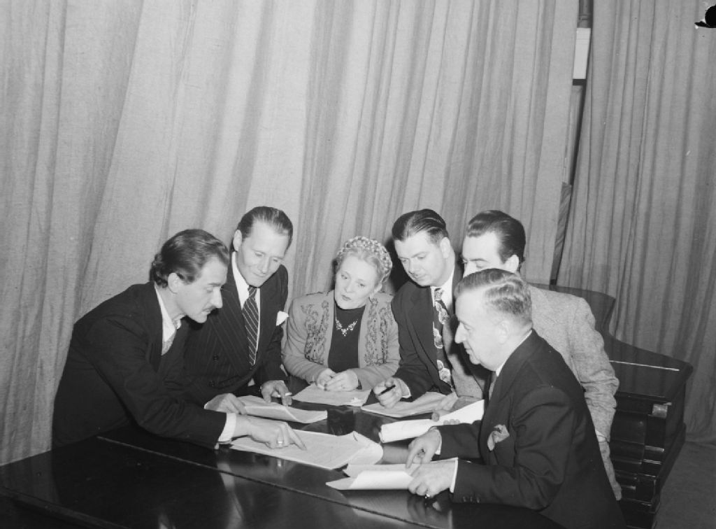 Groupe de comédiens réunis autour d'une table pour l'enregistrement du radiothéâtre "Ceux qu'on aime" d'Aliette Brisset-Thibaudeau diffusé par la station C.B.C. à Montréal. Nous apercevons, à partir de l'extrême gauche, le directeur dramatique, Paul Leduc, les comédiens Paul Guy, Jeanne Demons, François Lavigne, François Bertrand et Hector Pellerin