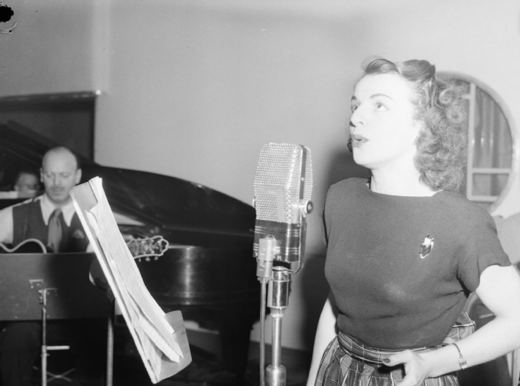 Nous voyons la chanteuse Alys Robi accompagnée d'un guitariste lors de l'enregistrement l'émission "À Ceux qui reviennent" radiodiffusée par la station C.B.C. (Radio-Canada) à Montréal