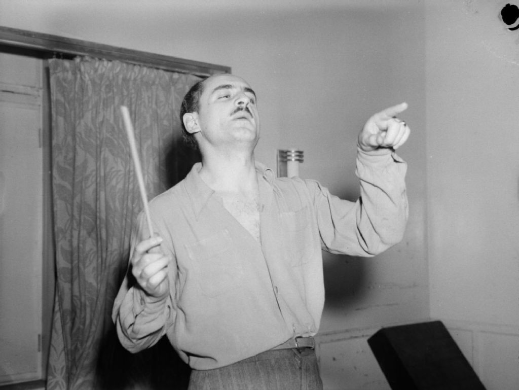 Le chef d'orchestre Lucio Agostini au pupitre lors de l'enregistrement de l'émission «À Ceux qui reviennent» radiodiffusée par la station C.B.C. (Radio-Canada) à Montréal