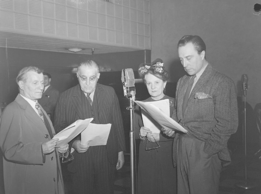 Quatre comédiens du radioroman «Baptiste» se donnant la réplique sur les ondes de la station C.B.C. (Radio-Canada) à Montréal. Nous reconnaissons, à l'extrême droite, François Rozet et, au centre, Pierre Durand