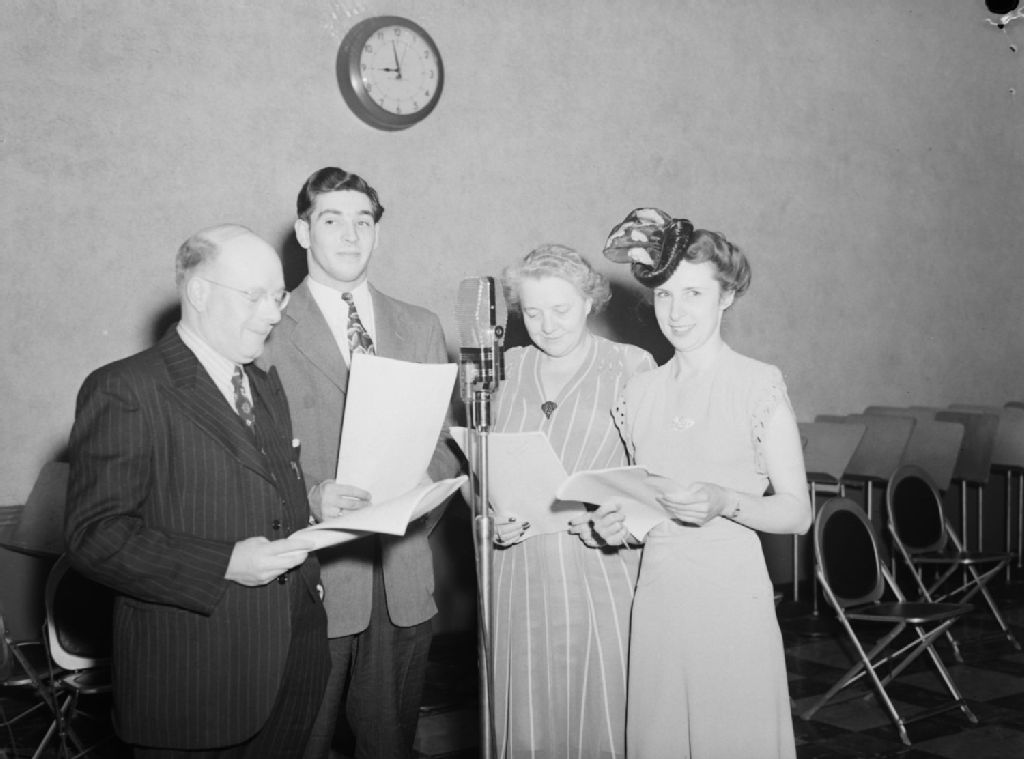 Deux comédiens et deux comédiennes du radioroman «Baptiste» se donnant la réplique sur les ondes de la station C.B.C. (Radio-Canada) à Montréal