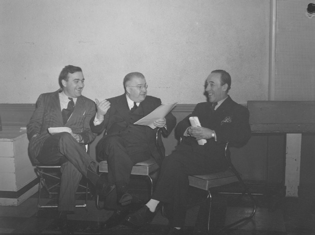 Trois comédiens du radioroman «Baptiste» diffusé sur les ondes de la station C.B.C. (Radio-Canada) à Montréal, discutant du scénario