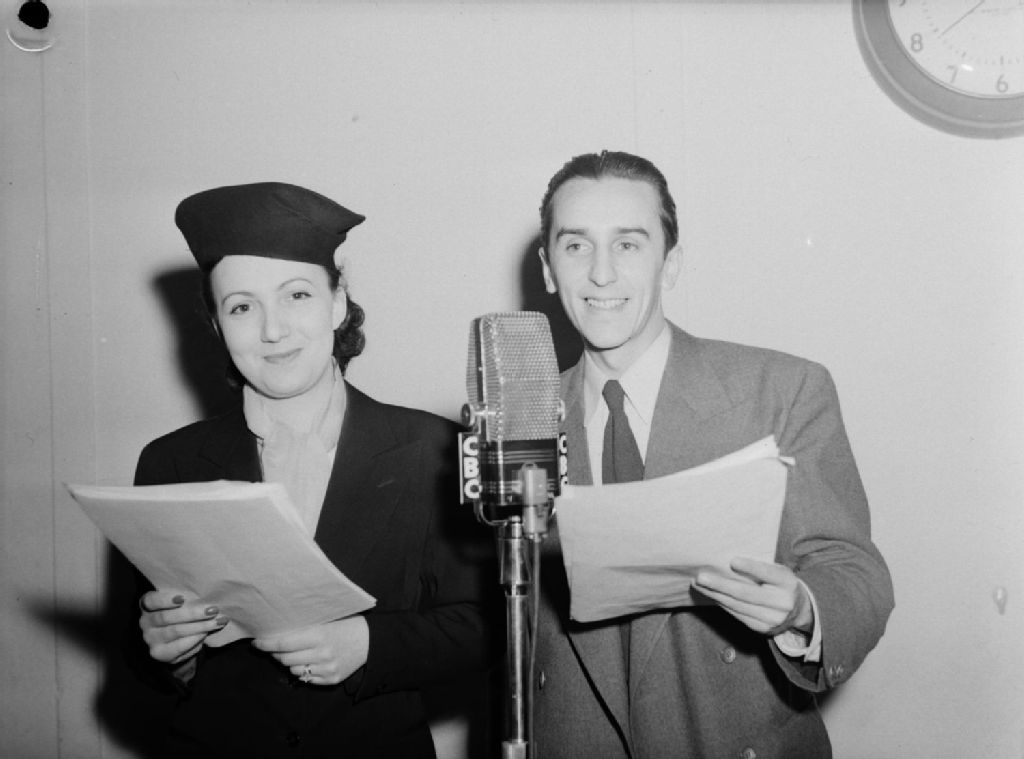 Un couple de comédiens lors de l'enregistrement du radioroman «Coeur Atout» diffusé sur les ondes de la station C.B.C. (Radio-Canada) à Montréal