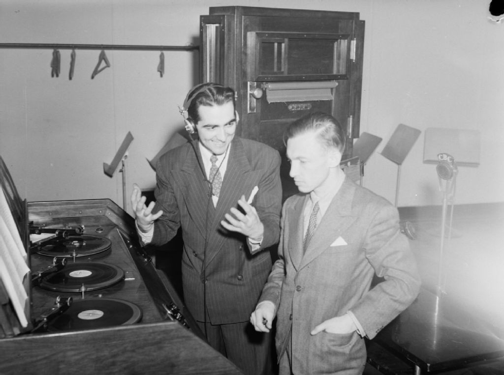 Deux bruiteurs en studio lors de l'enregistrement du radioroman «Coeur Atout» diffusé sur les ondes de la station C.B.C. (Radio-Canada) à Montréal