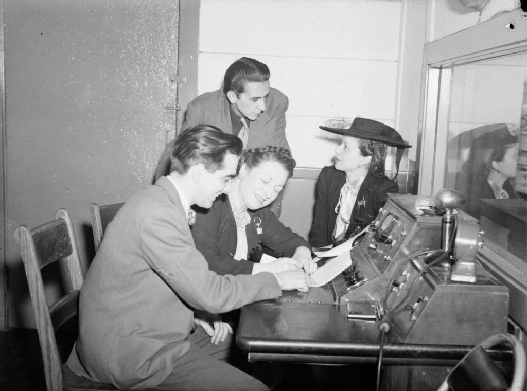 La réalisatrice Berthe Lavoie et trois membres de son équipe en studio lisant un scénario du radioroman «Coeur Atout» diffusé à la station C.B.C. (Radio-Canada) à Montréal
