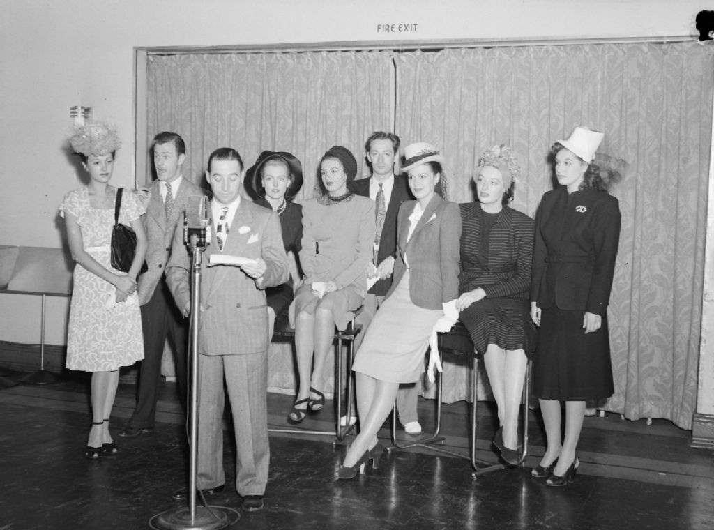 Un animateur présentant au micro la troupe des «Goldwyn Girls» dans les studios de la station radiophonique C.B.C. (Radio-Canada) à Montréal