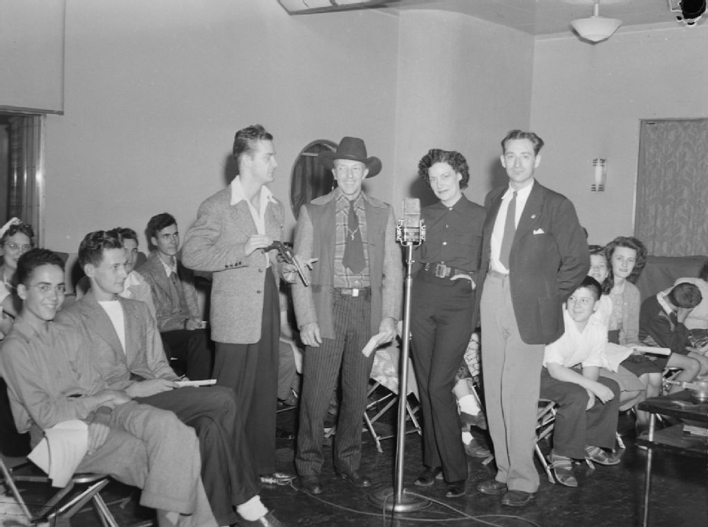 C. Miller et Frank Herron animant l'émission «Wake Up» radiodiffusée par la station C.B.M. (Radio-Canada) à Montréal. Nous apercevons C. Miller pointant avec un pistolet un couple d'artistes invités en tenue de style country