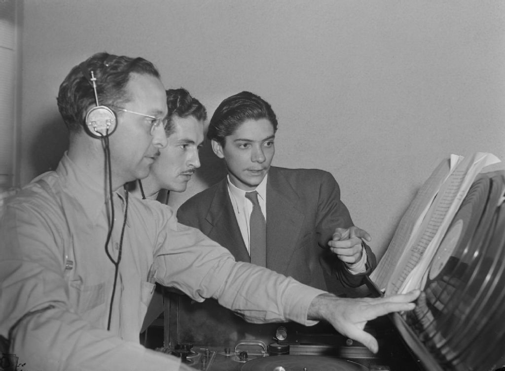 Pierre Dagenais, directeur de la troupe L'Équipe, avec deux techniciens travaillant à la trame sonore d'une émission radiophonique «Aux Quatre vents» diffusée par C.B.C. à Montréal