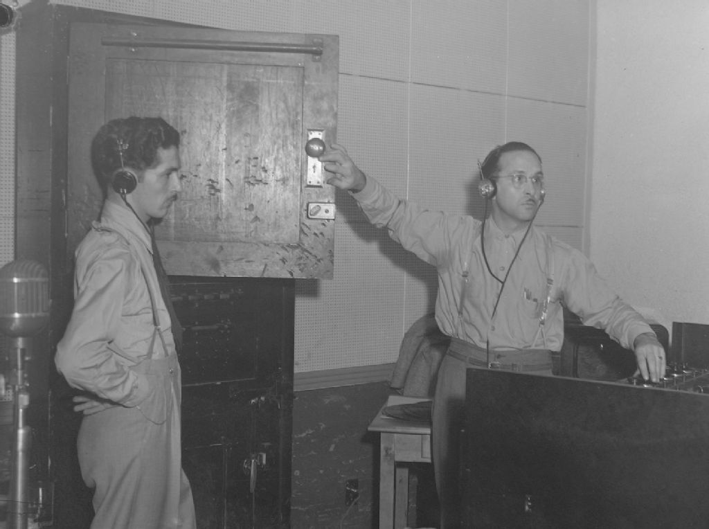 Deux bruiteurs à l'oeuvre lors de l'enregistrement de l'émission radiophonique «Aux Quatre vents» diffusée par C.B.C. à Montréal et mettant en vedette les comédiens de la troupe L'Équipe de Pierre Dagenais