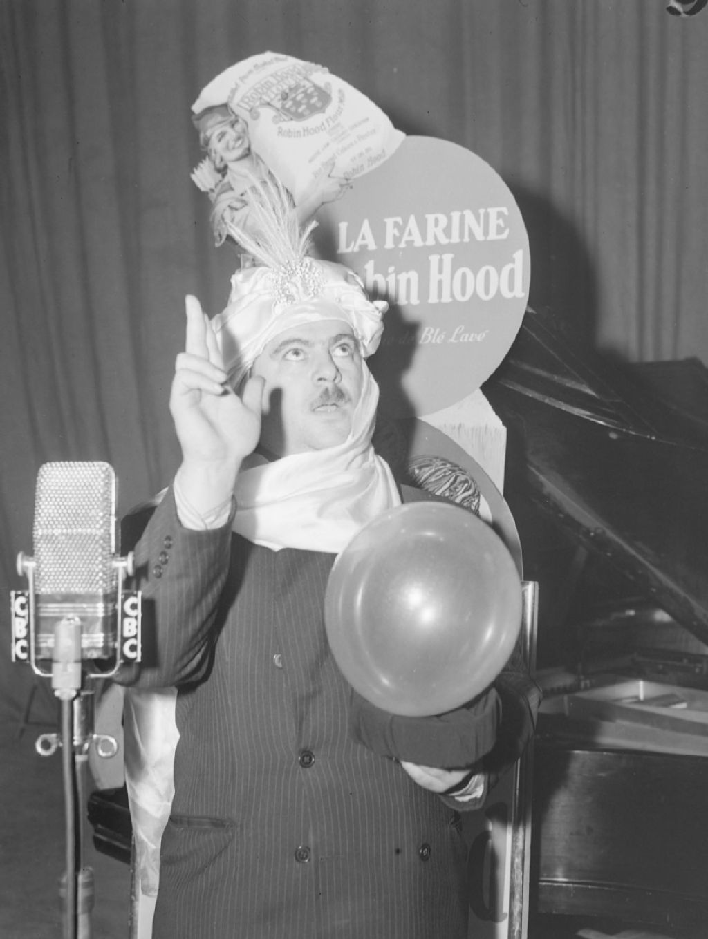 Le magicien Michel, coiffé d'un turban, donnant un spectacle sur scène avec sa boule de cristal lors de l'enregistrement de l'émission radiophonique «Talents de chez nous» diffusée par la station C.B.C. à Montréal. Nous apercevons à l'arrière-plan une réclame publicitaire pour la farine de marque Robin Hood