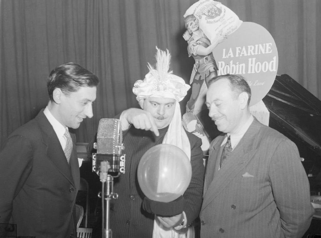 Le magicien Michel, coiffé d'un turban, donnant un spectacle sur scène avec sa boule de cristal devant deux animateurs dont Roger Baulu, lors de l'enregistrement de l'émission radiophonique «Talents de chez nous» diffusée par la station C.B.C. à Montréal. Nous apercevons à l'arrière-plan une réclame publicitaire pour la farine de marque Robin Hood