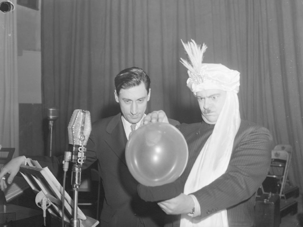 Le magicien Michel, coiffé d'un turban, donnant un spectacle sur scène avec sa boule de cristal devant l'animateur Roger Baulu, lors de l'enregistrement de l'émission radiophonique «Talents de chez nous» diffusée par la station C.B.C. à Montréal