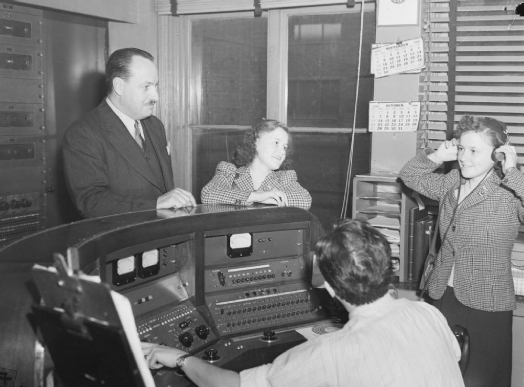 Deux jumelles visitant la salle de régie technique de la station radiophonique de C.B.C. (Radio-Canada) à Montréal. L'une d'elles se tient debout, coiffée d'un casque d'écoute derrière une console contrôlée par un technicien