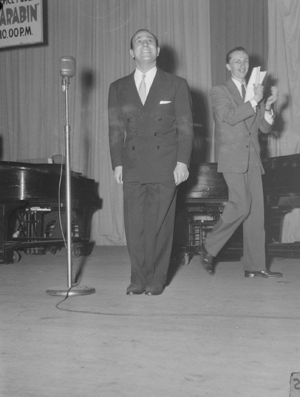 Le chanteur de charme Tino Rossi saluant après une prestation lors de l'enregistrement de l'émission «Radio Carabin» diffusée par C.B.C. à Montréal et commanditée par la brasserie O'Keefe. Nous apercevons derrière l'animateur Jean-Maurice Bailly encourageant les applaudissements
