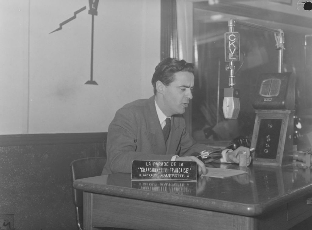 Guy Mauffette animant en studio l'émission «La Parade de la chansonnette française» diffusée sur les ondes de C.K.V.L. à Montréal