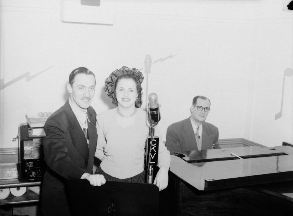 Roland Bayeur présentant une chanteuse accompagnée au piano par Billie Munroe lors d'une émission diffusée par C.K.V.L. à Montréal